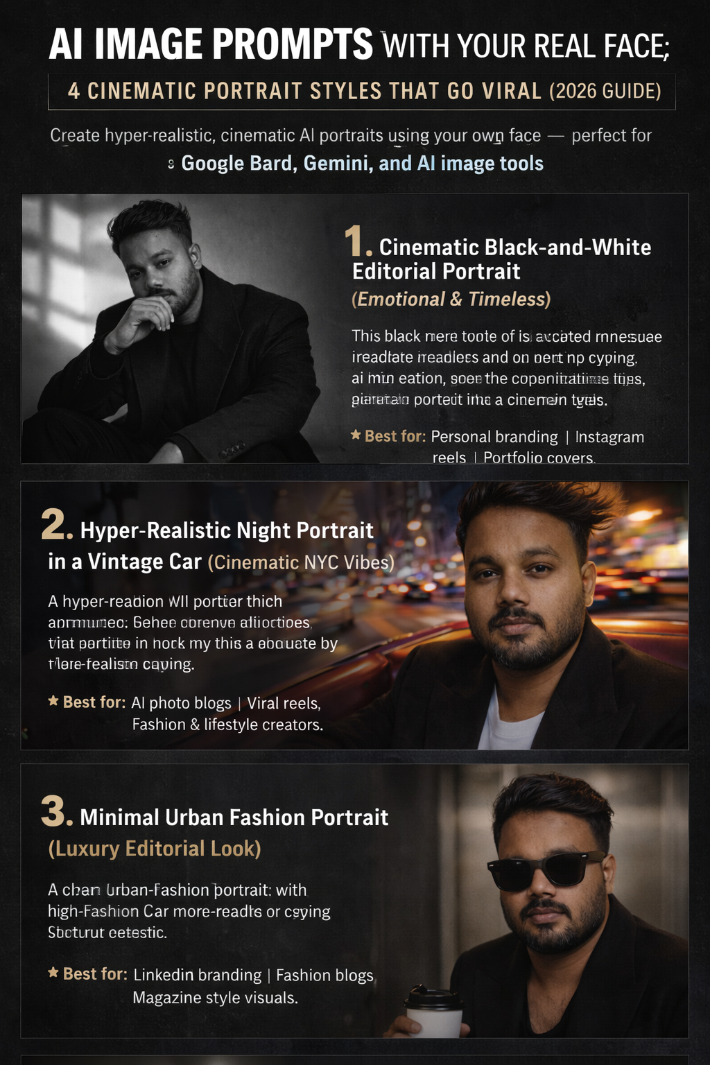 Keywords: AI image prompts, Google Bard image generator, Gemini AI portraits, face-accurate AI images, professional AI photography prompts, copy-paste AI prompts, realistic AI portraits, AI image generation with your face, ChatGPT portrait prompts, free AI image prompts